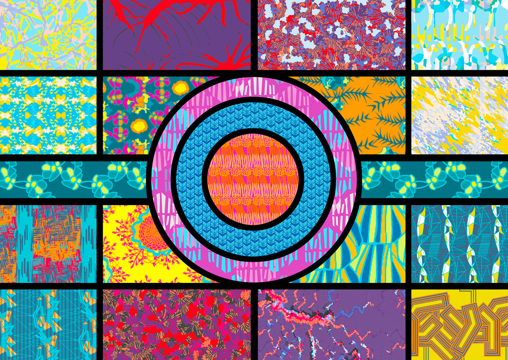 - Puzzle z motywem przedstawiającym wzorzysty kolaż.