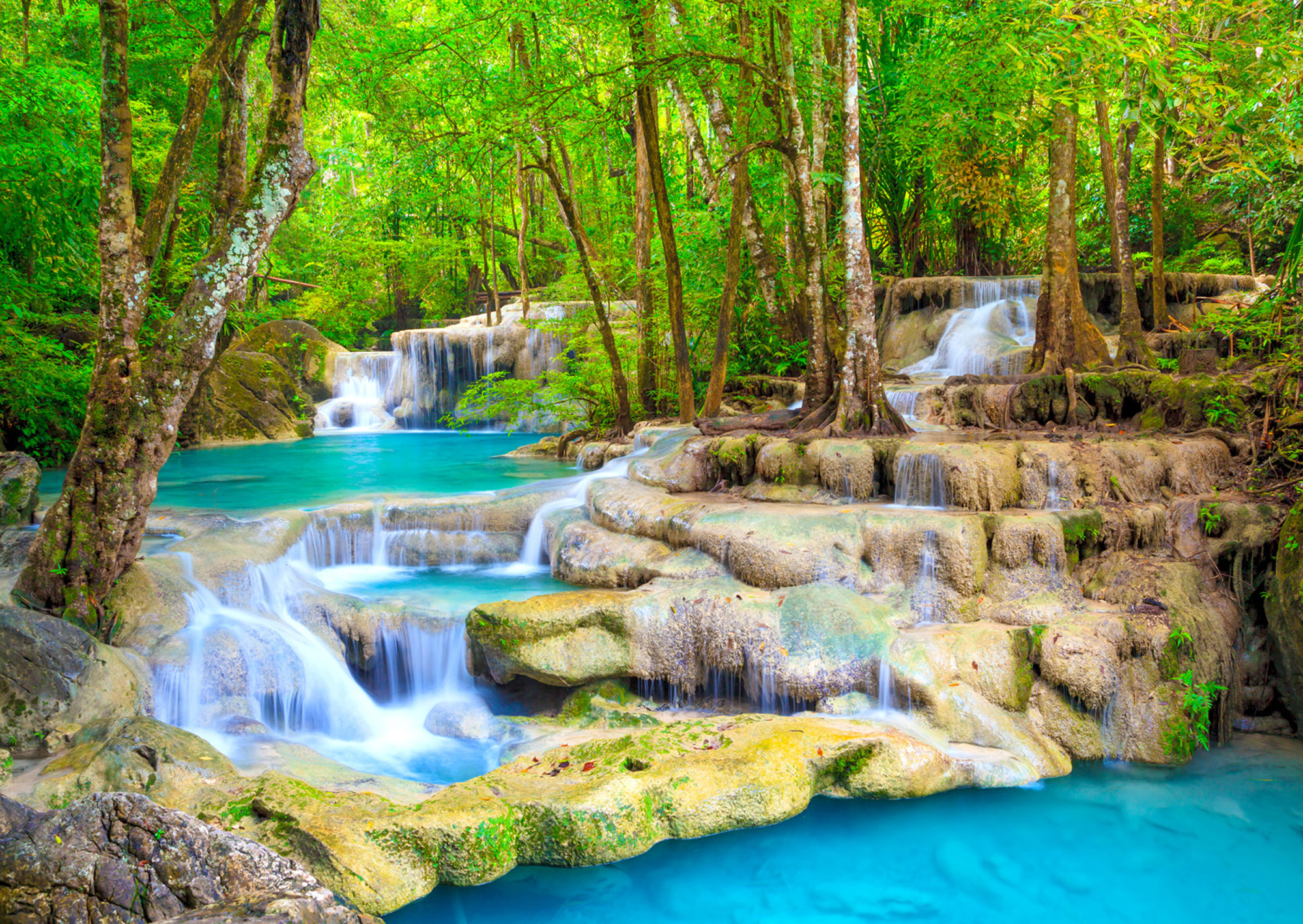 Widoczny tu wodospad znajduje się w Parku Narodowym Erawan, w zachodniej Tajlandii. Jest unikatowy, gdyż składa się z kilku poziomów. Turyści chętnie odwiedzają go również z powodu przepływającej przez niego czystej, turkusowej wody. Jej niepowtarzalna barwa została uchwycona także na przedstawieniu puzzlowym. Można dostrzec na nim też ciekawie ułożone skały i wiecznie zielony las. Puzzle te z pewnością spodobają się wielbicielom piękna natury oraz Tajlandii.